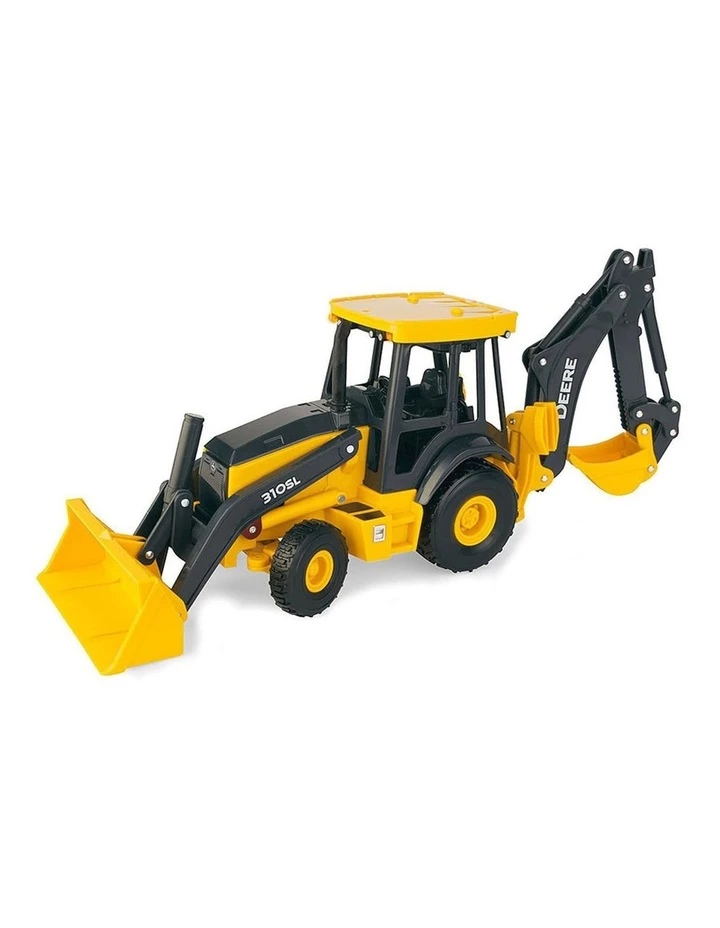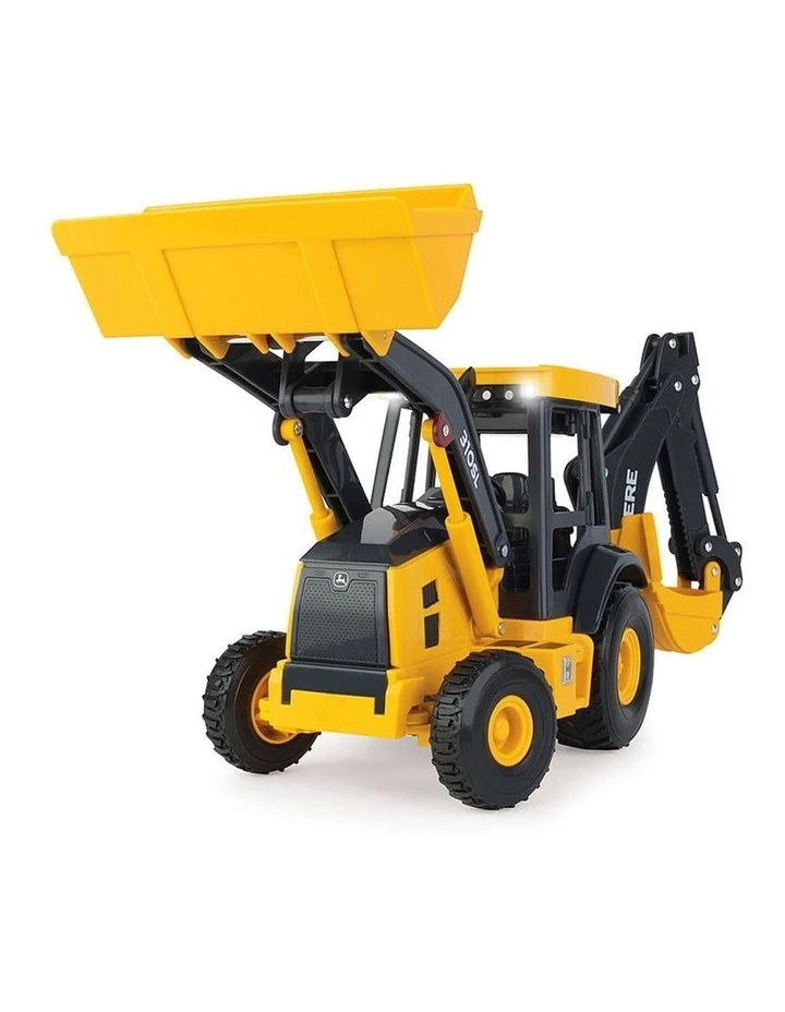 John Deere 1:16 Big Farm 310Sl Backhoe Loader features include working front and rear bucket along with lights and sounds.