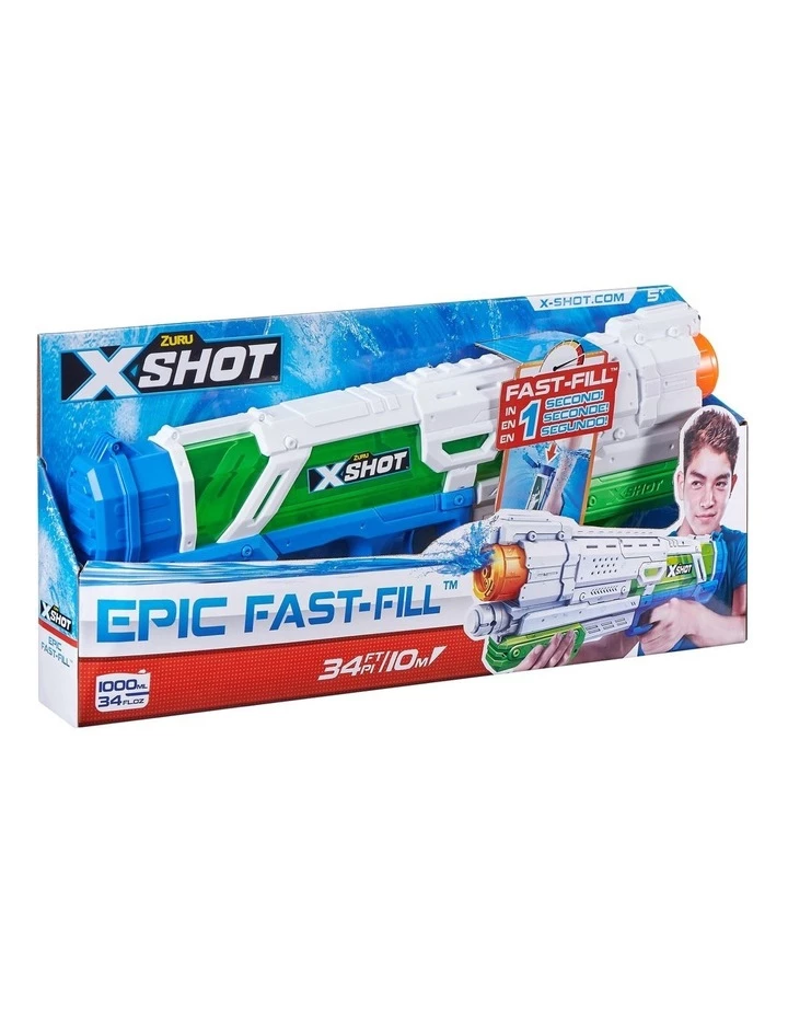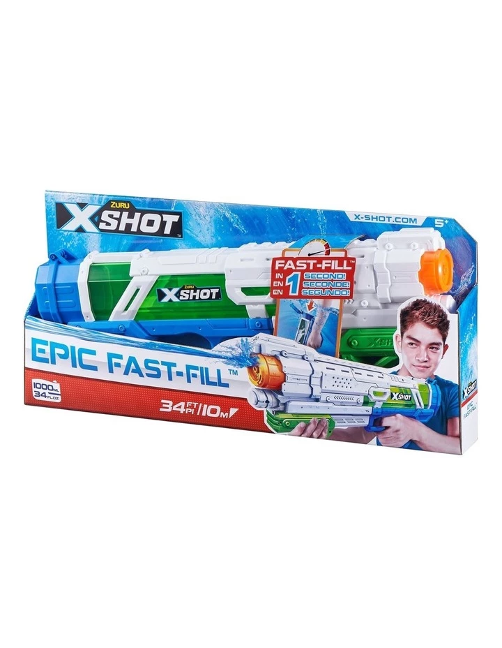 The water blasters under the X-SHOT Fast-Fill range are the the fastest filling water blasters ever created. The Epic Fast-Fill allows you to refill in just 1 second and get back to the water blasting action long before your opponents. Just dunk, fill and close with rapid sealing technology. It shoots up to 34ft/10m and you can fill it anywhere. Because a Fast-Fill is everything. Up Your Game!