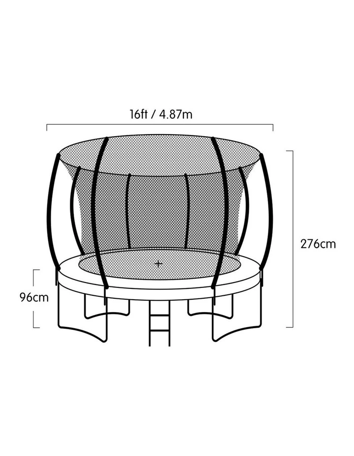 CONTENTS: * 1 x 16ft Trampoline with net * 1 x Shoe Storage compartment * 1 x Ladder * Carton Dimensions * 1 – 133 x 37 x 17cm – 41kg * 2 – 131 x 27 x 27cm – 35kg * 3 – 116 x 19 x 19cm – 28kg