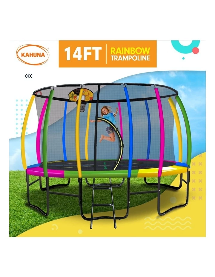 CONTENTS: * 1 x 14ft Trampoline with net * 1 x Basketball Set * 1 x Shoe Storage compartment * 1 x Ladder * Carton Dimensions * A – 186 x 37 x 13cm – 25kg * B – 172 x 50 x 9cm – 25kg * C – 115 x 37 x 18cm – 11kg * D – 116 x 41x 12cm – 18kg
