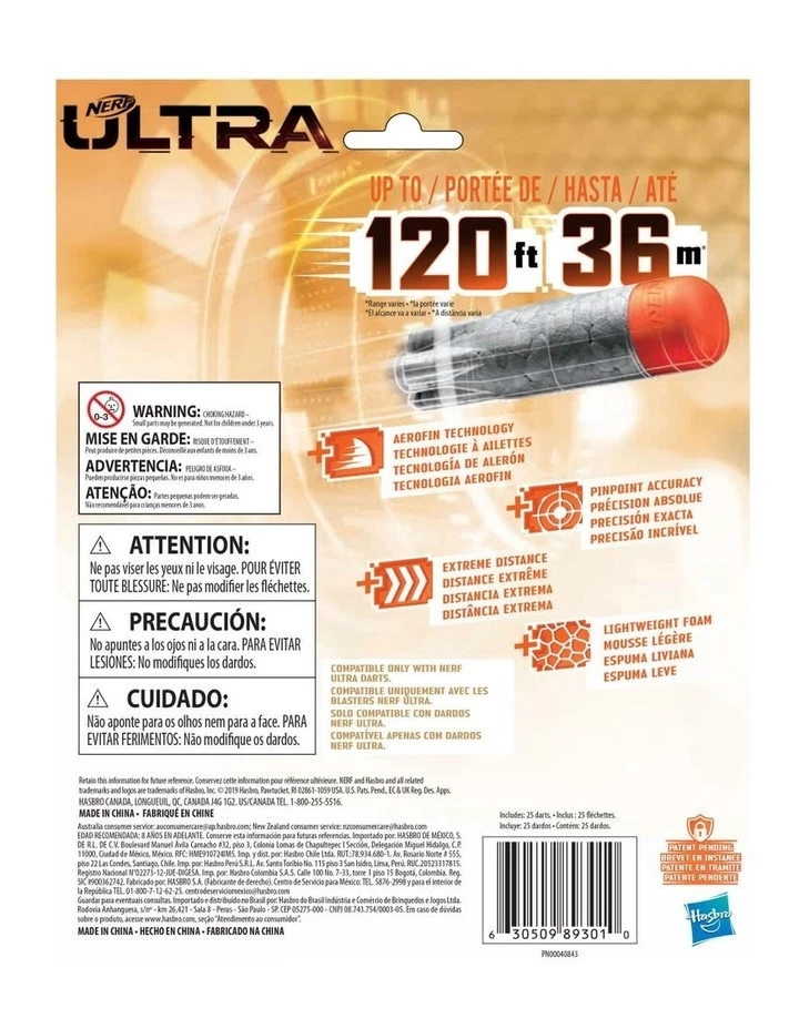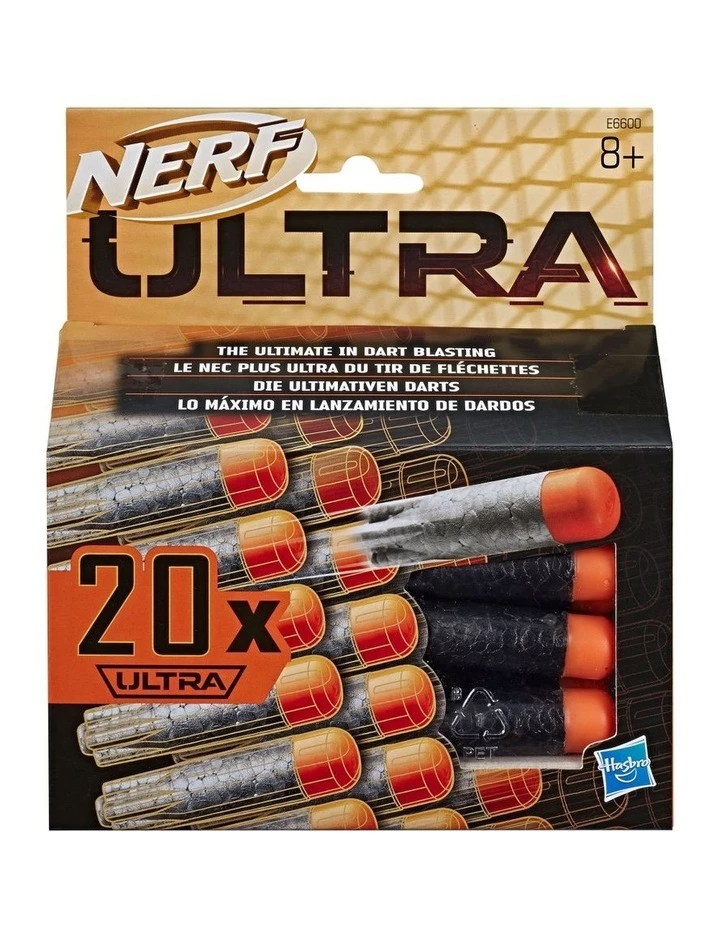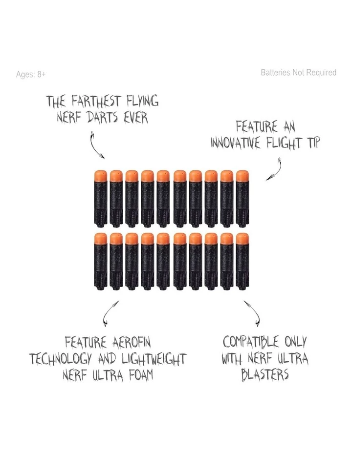 Stock up with this refill pack of 20 Nerf Ultra darts for Nerf Ultra blasters! Nerf Ultra darts are the farthest flying Nerf darts EVER — up to 120 feet (36 meters)! These ground-breaking darts feature an innovative flight tip, Aerofin technology, and Nerf Ultra foam. Nerf Ultra darts work only with Nerf Ultra blasters. Experience the gold standard in Nerf dart blasting with Nerf Ultra blasters and darts — their advanced design and performance delivers extreme distance, accuracy, and speed. Take your game to the next level with Nerf Ultra blasters and darts! (Blasters each sold separately.)