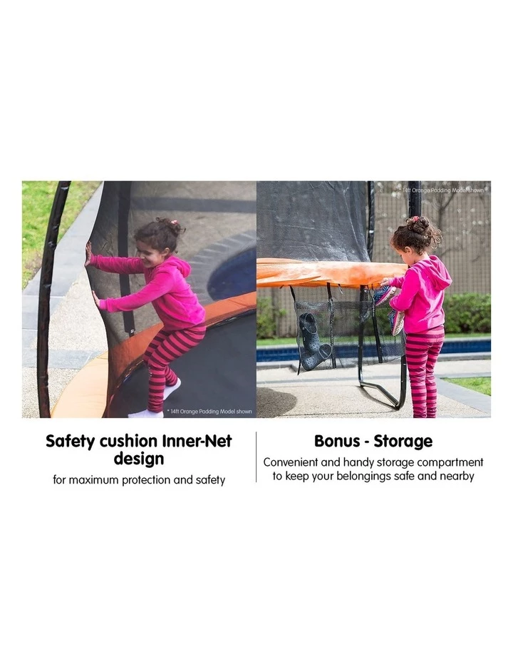 This trampoline uses linked legs for superior stability and structure of the legs also minimises the tendency for legs to dig into the ground. Legs also feature re-enforced joint bars to enhance strength and stability.The padding cover of the trampoline is UV stabilised and has embedded nylon mesh.
