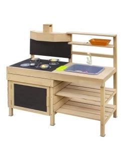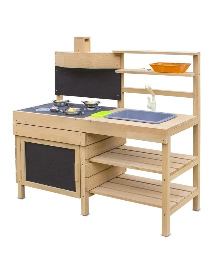 General StructureComes with storage cabinets & shelvesRemovable play tubOutdoor Pretend Kitchen Stove TopChalk boards for recipes or menusTreated timber for long term protectionRetractable Sliding TopMatte Stained wood for a smooth, natural finishBench Top Height: 55cm